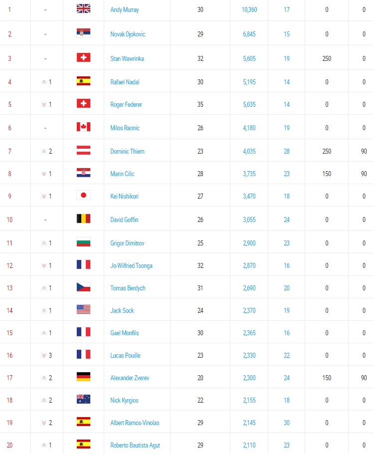 Per semplificare la lettura e non appensantire la trattazione, questa settimana mostriamo direttamente la top-20 come presentata ufficialmente dall’ATP. Attenzione alle colonne, da sinistra a destra abbiamo: ranking di lunedì 15 maggio 2017, variazione rispetto a settimana scorsa, nazionalità, nome del tennista, età (dato che tanto piace agli utenti), punti ATP, tornei disputati negli ultimi 12 mesi, punti in scadenza, punti che sostituiscono i punti in scadenza.