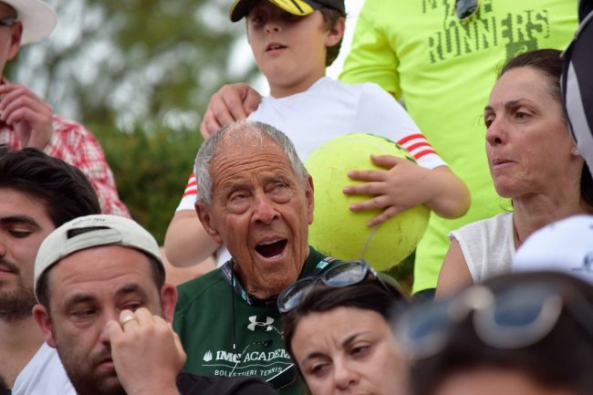 Essere lì per vedere la partita di un tennista all’ultimo anno di carriera non è di certo il massimo anche perché quello spicchio di tribuna è completamente pieno e sul campo adiacente ci sono Suarez Navarro e Bellis intente in un’altra battaglia. Dietro di noi scorgiamo anche Nick Bollettieri, seduto sui gradoni per gustare il match più bello del martedì romano. “Mr. Bollettieri anche lei sul campo 2 per vedere Tommy”– gli chiediamo durante un cambio campo – “Of course” risponde col suo solito sorriso. Più tardi incroceremo anche Claudio Pistolesi, probabilmente uno sguardo al vecchio Tommy l’avrà dato anche lui.
