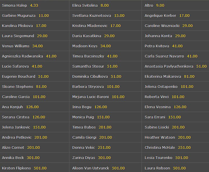 Non sono un esperto di scommesse, ma mi colpisce che malgrado i tanti nomi presi in considerazione ci sia come terza forza (data a 9) la voce “altro”. Un altro aspetto che non attendevo è la presenza con quote tutto sommato degne di nota di Petra Kvitova e Sloane Stephens, che sono ferme da mesi, e per le quali non ci sono certezze nemmeno sulla loro presenza. Ma forse si tratta di valutazioni legate all’eventualità che possano comunque essere scelte da una parte di scommettitori.