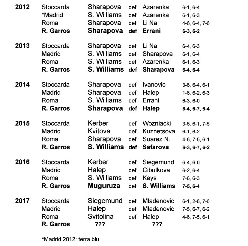 Come si vede, fino al 2014 c’era stata una notevole corrispondenza tra chi faceva bene a Stoccarda, Madrid, Roma e chi poi arrivava in fondo anche a Parigi. Ma dal 2015 nemmeno questo aspetto sembra essere più significativo. Piccola consolazione: quest’anno abbiamo almeno avuto il vantaggio di avere visto all’opera tutte le possibili protagoniste del prossimo Roland Garros, senza che ci siano stati forfait (fisici o per assenze programmate) come invece spesso era accaduto in passato.