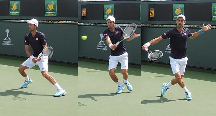 Qui sopra, Nole impatta alla perfezione una risposta di rovescio. Da notare la splendida azione di trasferimento del peso, con trascinamento del piede destro in assoluta sincronia con lo swing a colpire.