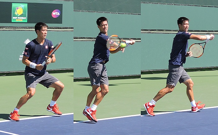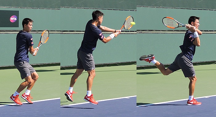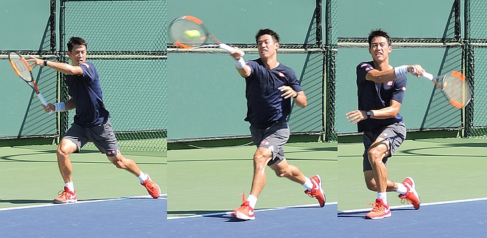 Da sinistra a destra la preparazione, l’impatto, e soprattutto, nel frame di destra, l’impressionante proiezione in avanti della racchetta, con rotazione interna dell’avambraccio a coprire la palla. Il gesto necessario a “tenere” la pallata appena respinta, totalmente in contrasto all’inerzia del corpo verso la sua destra, fatto di puro braccio nell’impossibilità di accompagnare lo swing con la rotazione busto-spalle data la postura obbligata dall’allungo laterale, è incredibile. Kei finisce praticamente con le braccia annodate, “abbracciandosi” da solo, mantenere controllo in questa situazione è un numero di alta scuola.