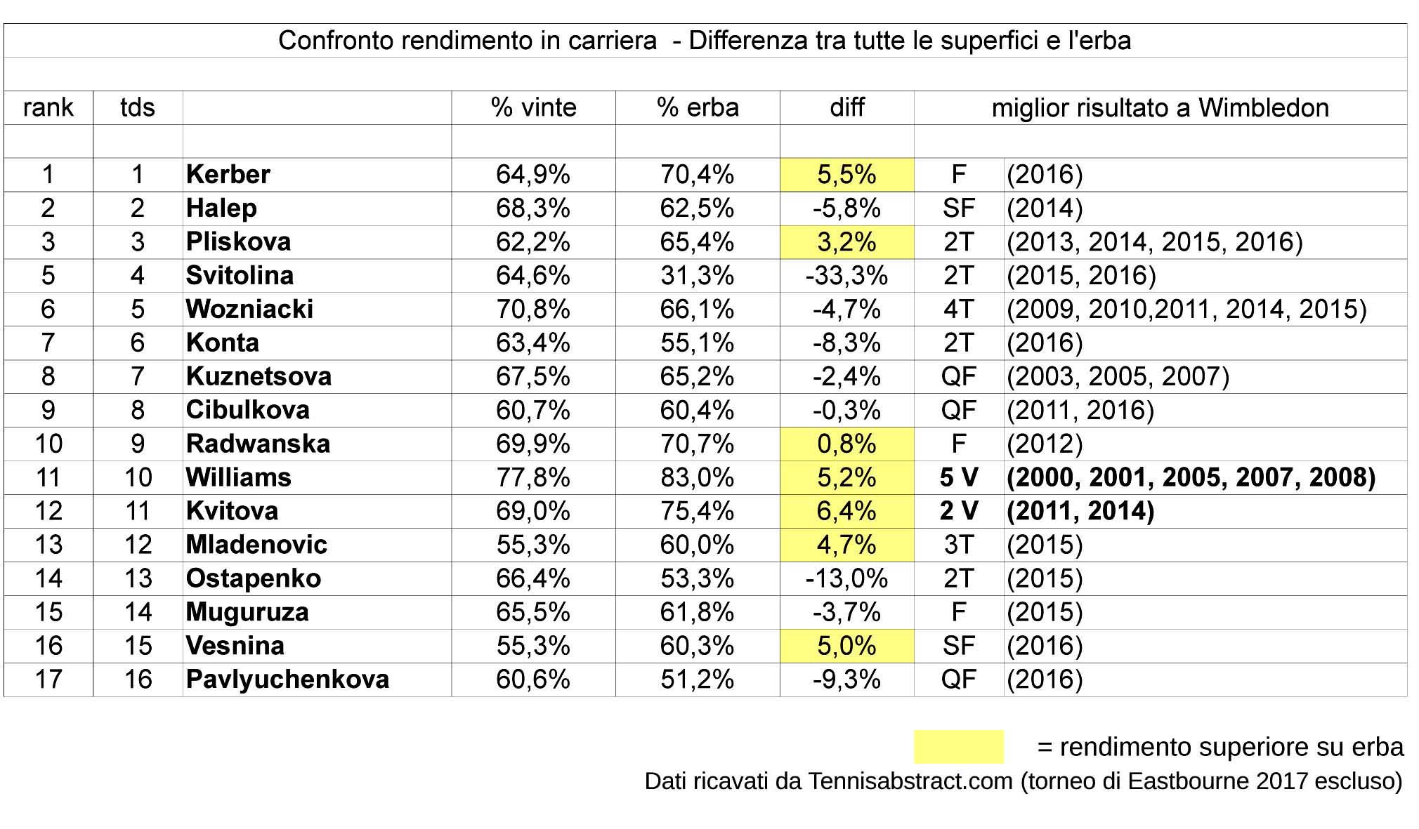 La vittoria al Roland Garros di Jelena Ostapenko ha dimostrato come in questo momento sia difficile avere certezze, e quanto le condizioni di forma possano essere determinanti. In più va tenuto presente che il periodo dei tornei su erba è il più breve di tutta la stagione, ed è quindi la superficie che meno incide in termini di punti per determinare il ranking. Dunque la classifica WTA non restituisce in pieno il rendimento e la capacità delle giocatrici nell’adattarsi al gioco sui prati, un gioco che richiede e valorizza qualità particolari.