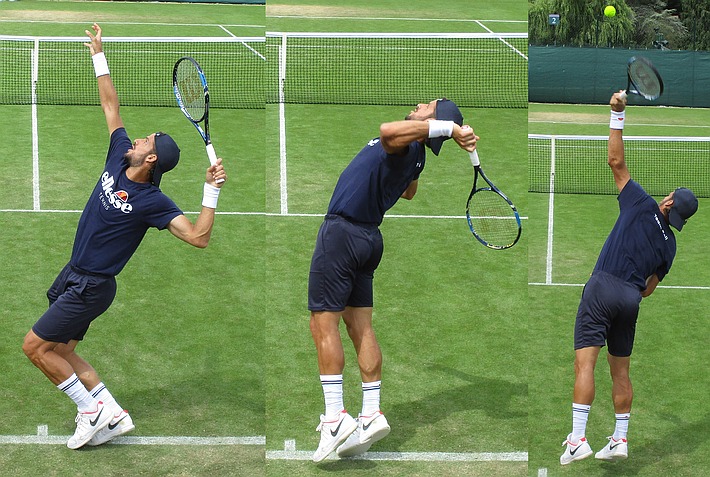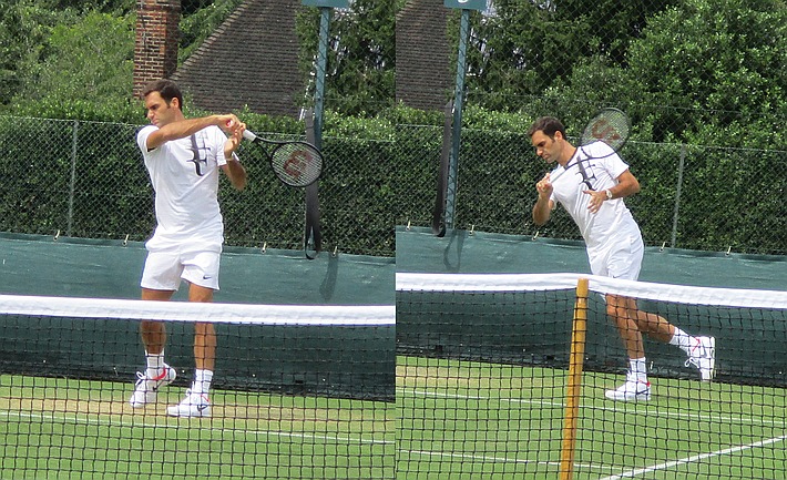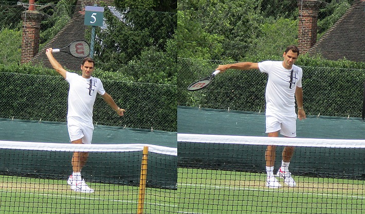 Guardate qui sopra come ce lo fa vedere bene Feliciano Lopez, che si allenava nel campo adiacente: osservando il frame di sinistra, possiamo notare come la testa della racchetta, a fine rilascio del lancio di palla, sia più chiusa in avanti di 45 gradi buoni. Il resto dell’esecuzione di “Deliciano” è ineccepibile, chissà se la vittoria recente al Queens lo avrà caricato a dovere, perchè vederlo giocare sull’erba è veramente notevole.