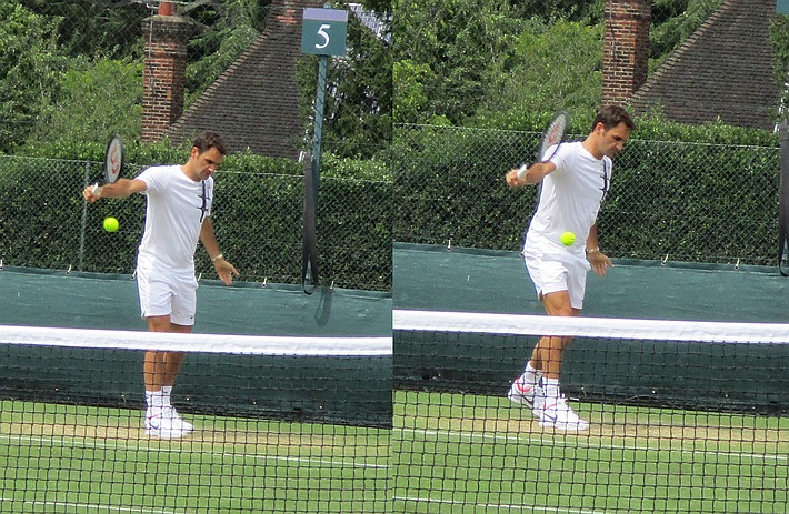 Roger Federer, sul lontano e irraggiungibile (manca un vialetto laterale al campo, che è su un terrapieno) court 5 della “practice area”, quindi non il court 5 dell’impianto principale, ha giocato con Jiri Vesely. Qui sopra, lavoro sul dritto, a destra uno dei suoi caratteristici inside out a sfilare il corpo dalla palla.
