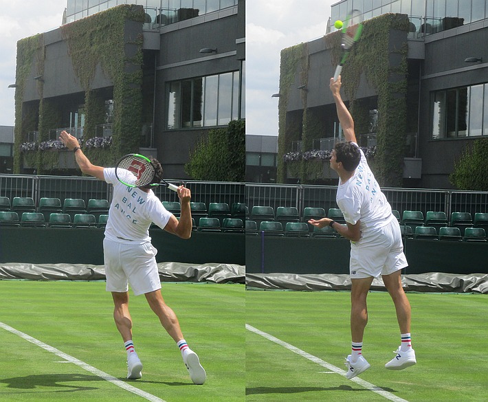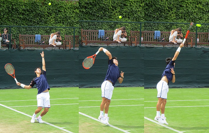 Poco più in là, campo 7, Kei Nishikori ha lavorato tanto, ma tanto sul servizio, evidentemente consapevole dell’importanza di questo colpo specialmente sui prati. Mi è sembrato a posto fisicamente, ma con Kei non si sa mai. Il movimento risente ancora di un eccessivo distanziamento della racchetta dal corpo in fase di caricamento, la “trophy position” che vedete nel frame a sinistra.
