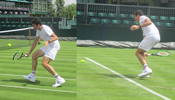 Infatti, come vediamo qui sopra, non si è risparmiato, andando a recuperare con ottimo scatto un drop-shot che lo aveva mandato in corridoio (frame a sinistra). In ogni caso, quando c’è da tirare su uno slice ben giocato, che su erba letteralmente non rimbalza ma striscia via (frame di destra, guardate quanto bassa sta la palla, siamo all’altezza dei calzini di Milos), un lungagnone come Raonic ha i suoi bei problemi da risolvere.