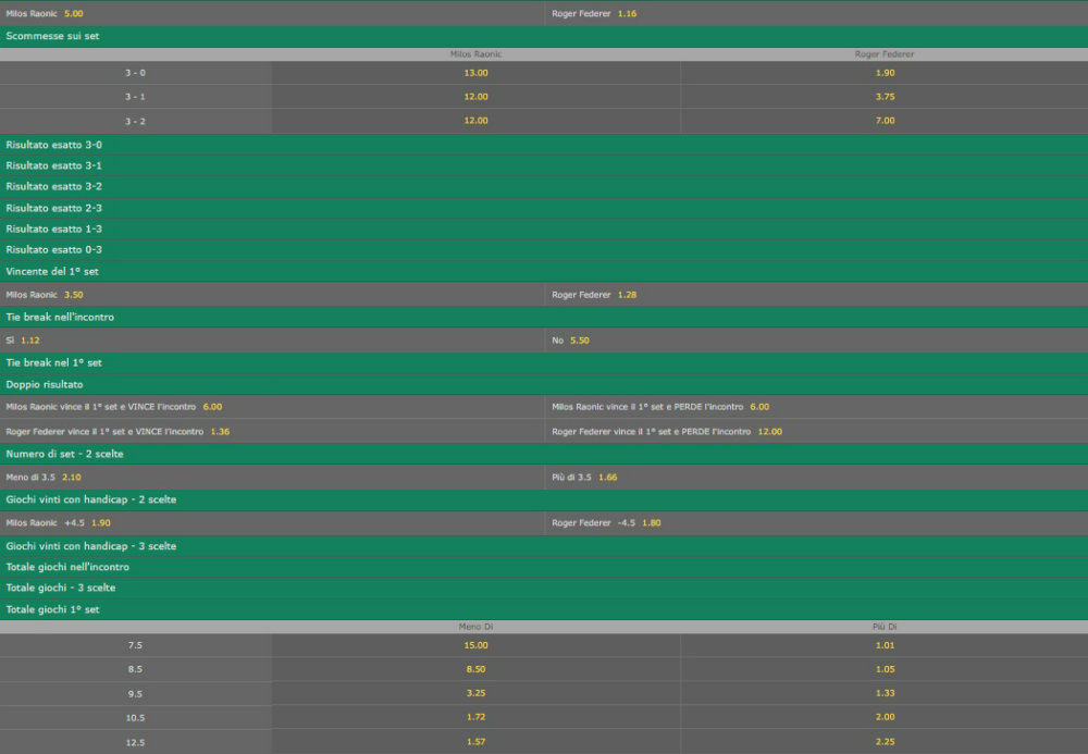 I quarti di finale maschili: le quote dettagliate