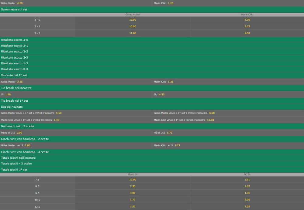 Muller ha speso tantissimo contro Nadal. Ma ancora più di questo fattore, che comunque potrebbe incidere su un giocatore che non fa della condizione atletica il suo punto di forza, a indizzare questo incontro dovrebbe essere il clamoroso rendimento di Cilic in questo torneo e in generale sull’erba. Praticamente in quattro sofferto non ha mai sofferto neanche lontanamente. Muller gli proporrà un tennis diverso, ma non dovrebbe bastare. (Primo set over 10.5 game -> quota 2)