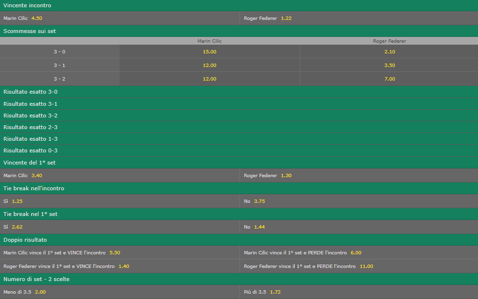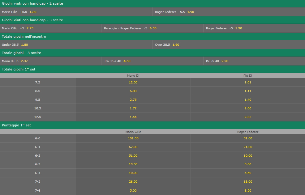 Wimbledon, finale maschile: le quote dettagliate