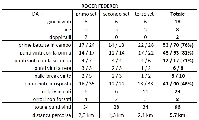 In sintesi, anche questi dati nel loro piccolo confermano una volta di più che la versione 2017 del Cigno di Basilea è forse…. meno cigno e più rapace. Vincere, seppure con somma eleganza e classe, evidentemente conta per lui più di qualunque altra cosa ora che il calendario segna 36 primavere. Vedremo presto se l’Aquila di Basilea continuerà a volare alto anche negli States dove, peraltro, di aquile se ne intendono.