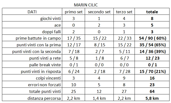 Le 23 discese a rete effettuate in tre set contro le 17 in quattro contro Querrey e il rapporto vincenti/errori non forzati (16/23) paiono indicare da un lato la sua volontà di accorciare il più possibile gli scambi dall’altro una scarsa lucidità . Le insufficienti percentuali di punti vinte con la prima e la seconda palla di servizio, rispettivamente il 65 e il 39 per cento, sono sicuramente riconducibili alla qualità della risposta del suo avversario, ma sono oggettivamente troppo modeste per un battitore del suo calibro per non essere dovute anche alle sue difficoltà negli spostamenti. Come sempre accade in questi casi, purtroppo per lo spettacolo, l’handicap di un giocatore finisce per condizionare il rendimento dell’altro.