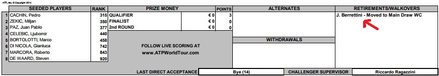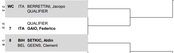 Per il 18enne Berrettini ci sarà la chance di disputare il primo incontro a livello Challenger. Jacopo sinora aveva giocato soltanto a livello Futures, ottenendo un prize money di appena 2468 dollari. Affronterà al primo turno un qualificato: chissà, magari lo stesso Paz che avrebbe dovuto già affrontare.