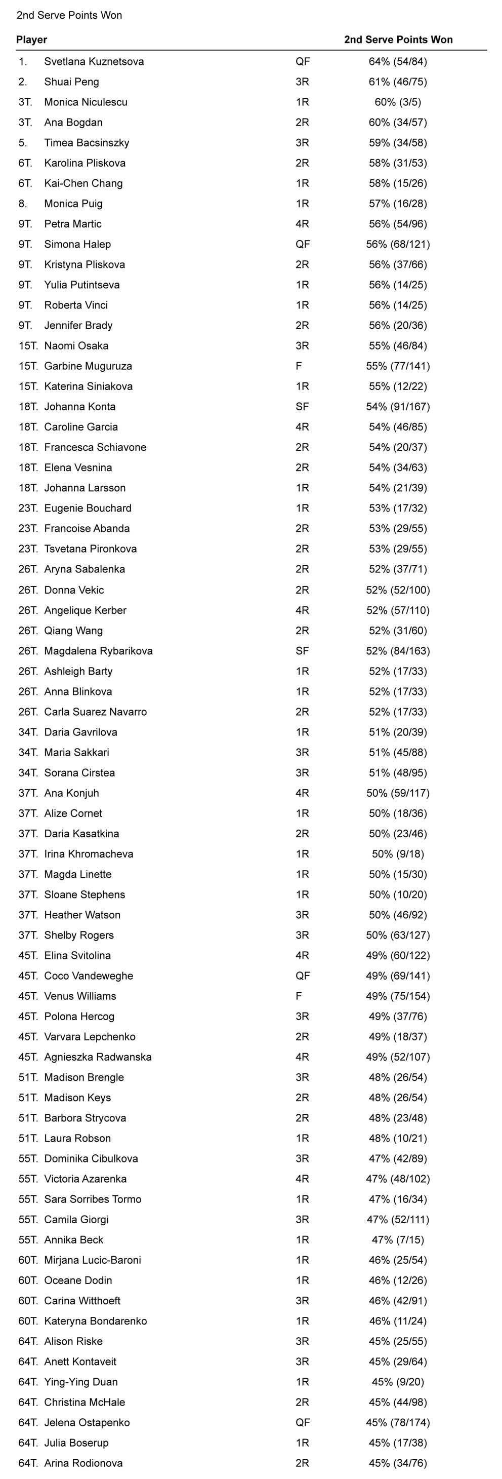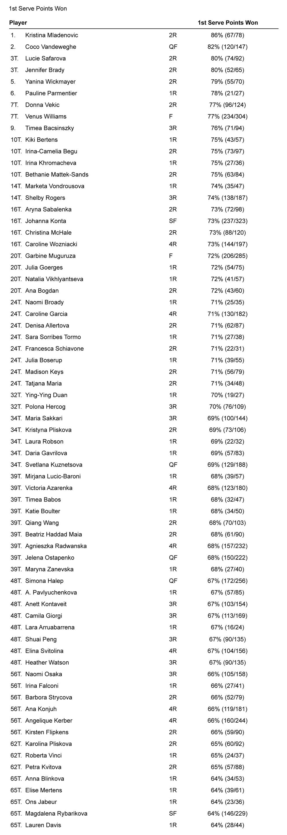 Con le prossime tabelle si comincia a considerare l’intera evoluzione dello scambio, anche se nei primi due casi sempre in relazione con il servizio. Nella prima classifica sono presentati i punti vinti (in percentuale) sulla prima di servizio. Mladenovic si conferma come la giocatrice più efficace, ma non trascurerei (anche per il maggior numero di partite valutate) la seconda posizione di Coco Vandeweghe.