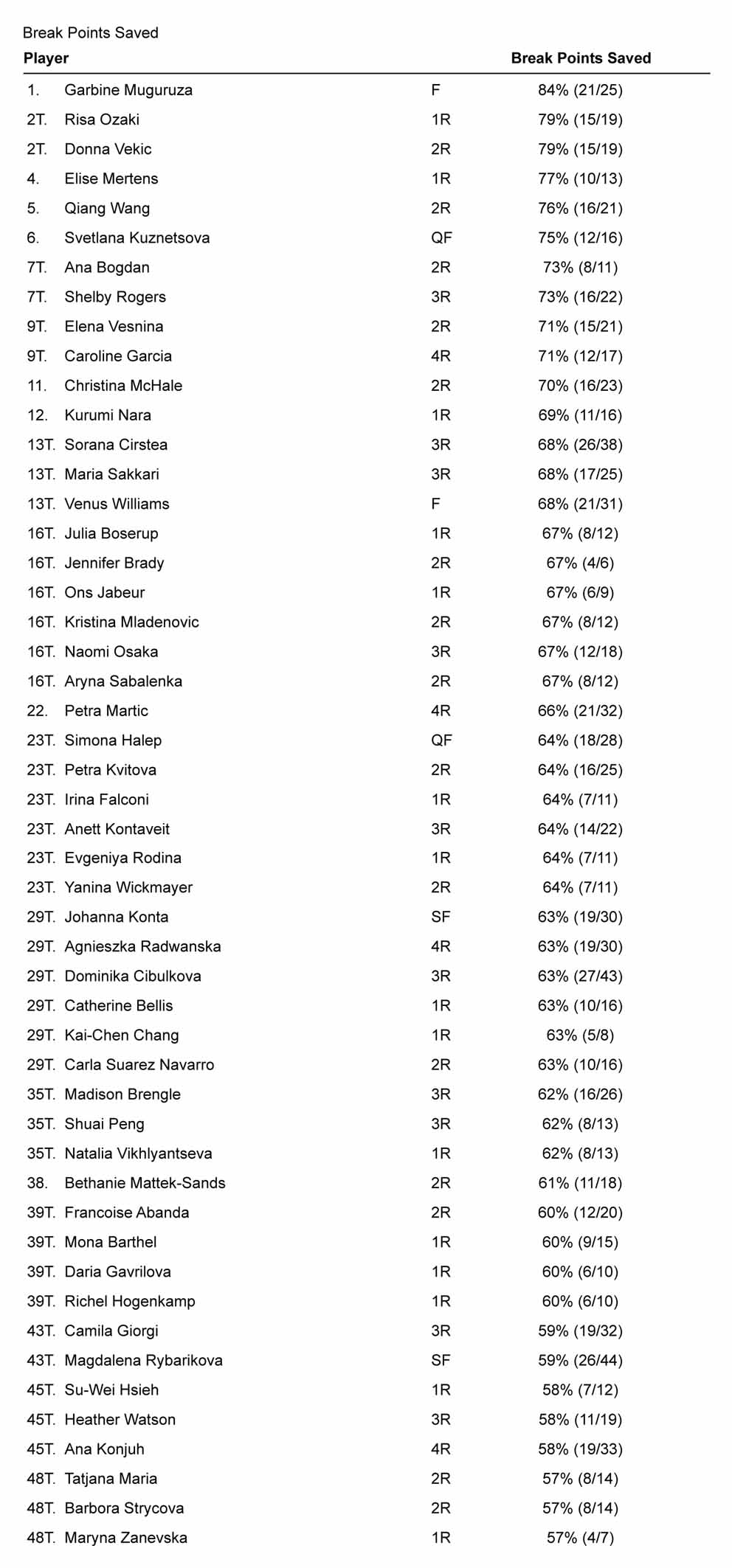 Stacca tutte, con un 5% di vantaggio, proprio la vincitrice, Garbiñe Muguruza, che ha numeri davvero da torneo su erba: appena 4 break concessi in sette partite, e 21 palle break salvate su 25. Eppure non stiamo parlando di una giocatrice con un servizio così dominante. Probabilmente era in una condizione mentale eccezionale, che le ha permesso di giocare al meglio i passaggi chiave delle partite.