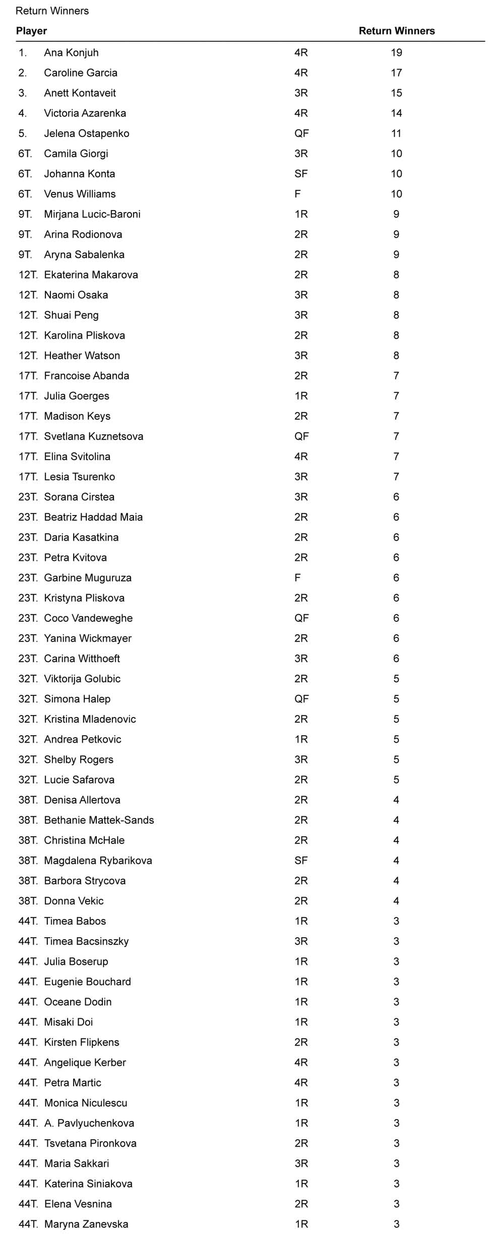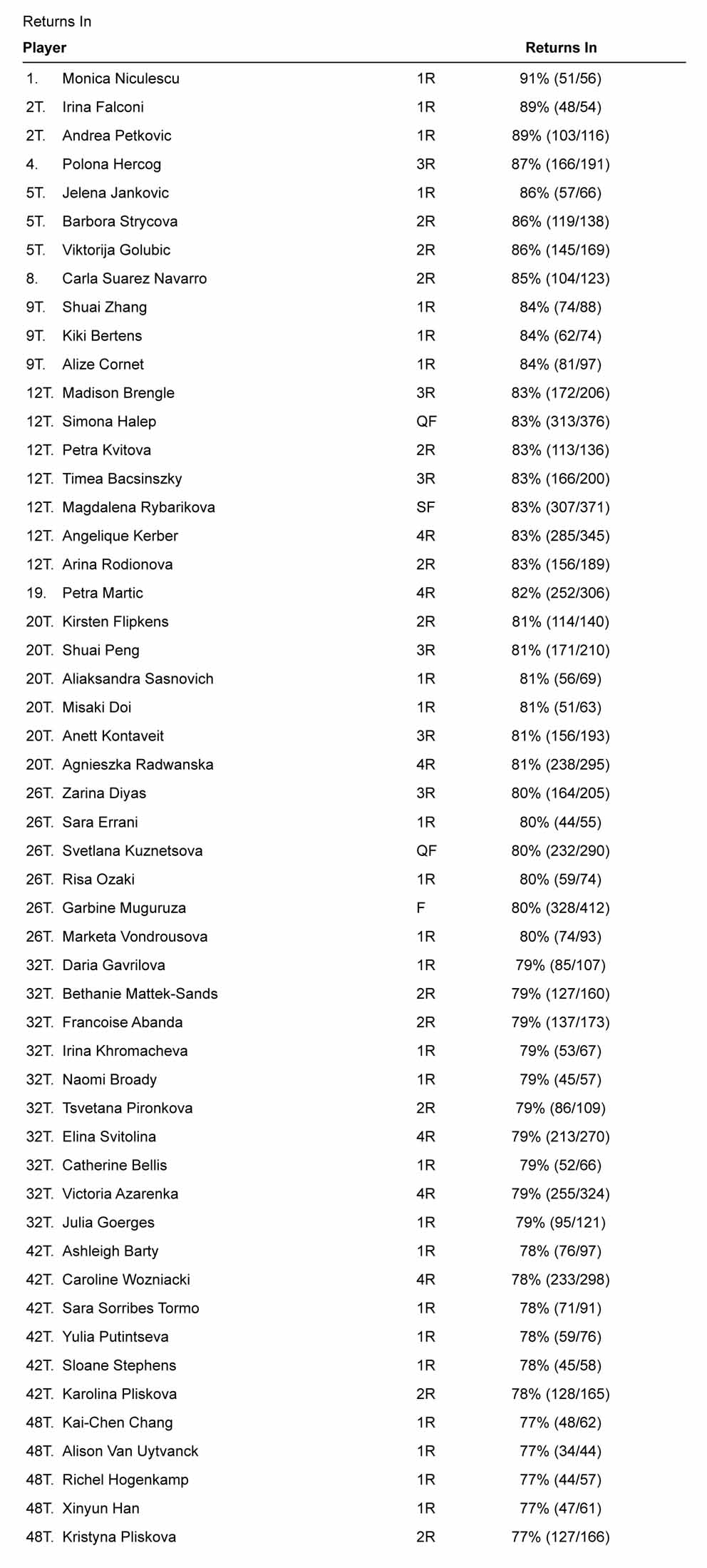Sezione dedicata alle risposte, con due statistiche differenti. La prima è relativa alla capacità di non sbagliare la risposta, mettendo comunque la palla in campo, e obbligando l’avversaria al servizio a giocare come minimo un altro colpo. Va sottolineato che ai primi posti di questa classifica ci sono giocatrici che hanno disputato un solo match (e dunque l’hanno perso); per cui credo che per avere riscontri più significativi occorra scorrere verso il basso l’elenco, sino all’arrivo di alcune protagoniste che hanno raggiunto la seconda settimana, e che di questa qualità hanno saputo realmente avvantaggiarsi. Segnalo Halep e Rybarikova (83%), e poi Kuznetsova e Muguruza (80%). Spicca al contrario in negativo (tanto da non essere presente in questi primi posti) il 66% di Johanna Konta (106mo posto).