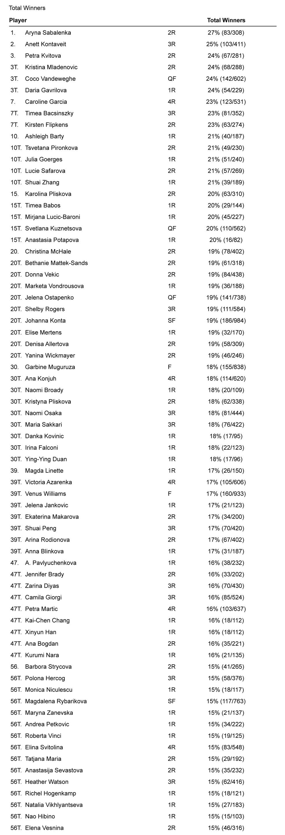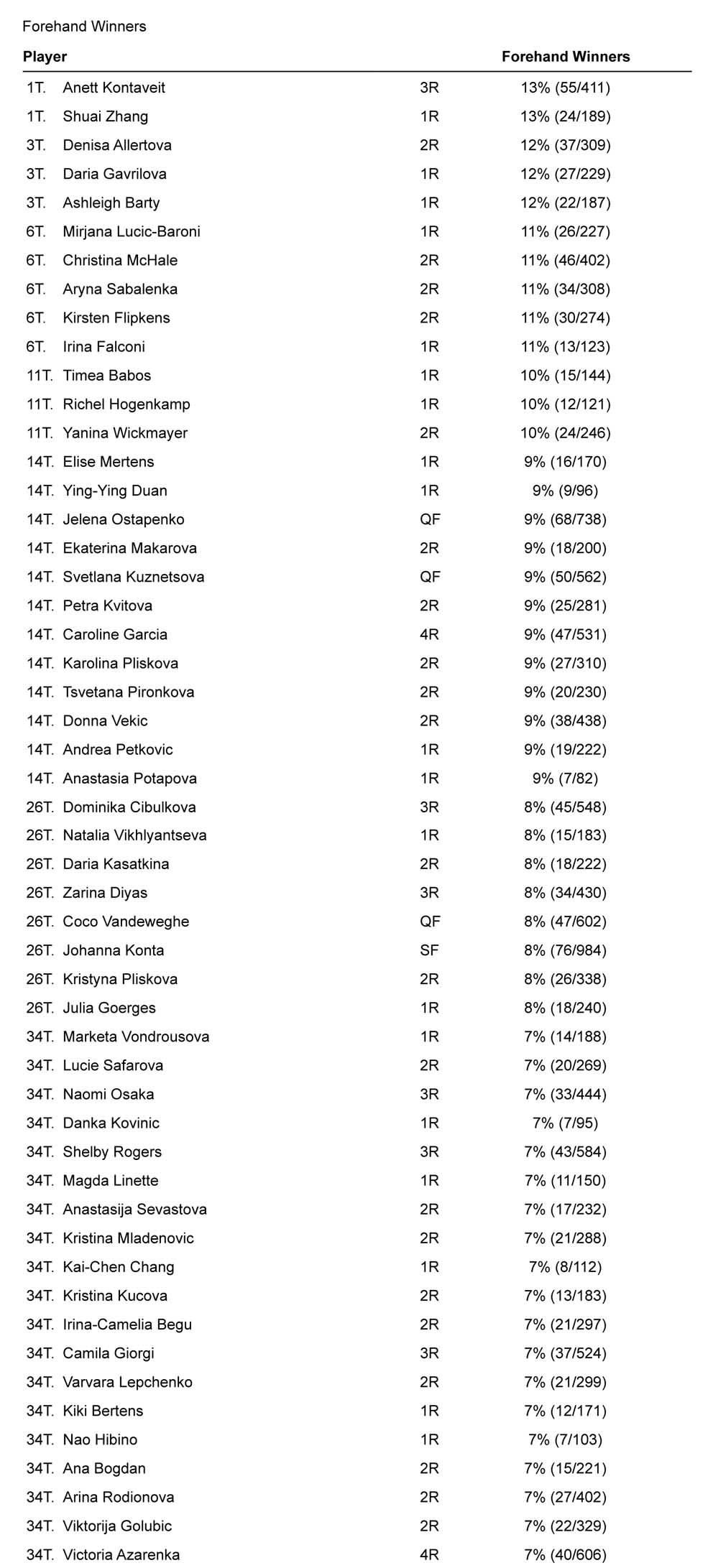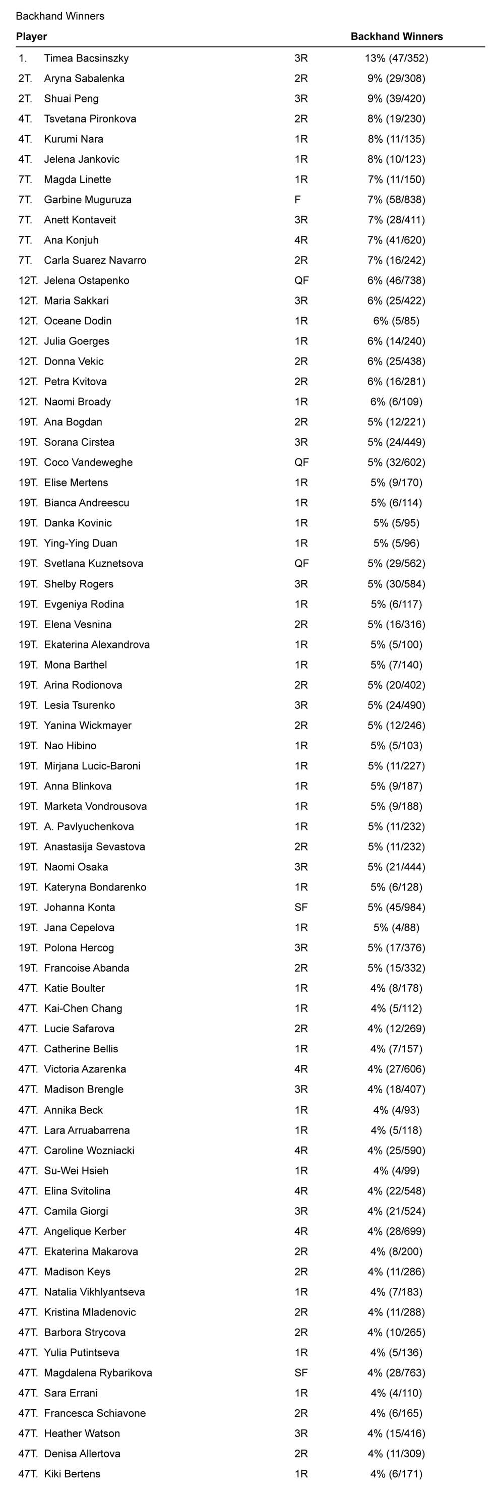 Se abbandoniamo i numeri totali e ci addentriamo nell’efficacia dei singoli colpi, ritroviamo ai vertici giocatrici dalle caratteristiche abbastanza note. Forse l’aspetto più interessante è l’assenza di Muguruza, che si ferma al 111mo posto nella classifica relativa ai vincenti di dritto. Di tutte le classifiche del torneo, questa è quella in cui fa peggio, a conferma del fatto che in a Wimbledon 2017 ha mostrato una evidente differenza di incisività fra dritto e rovescio.