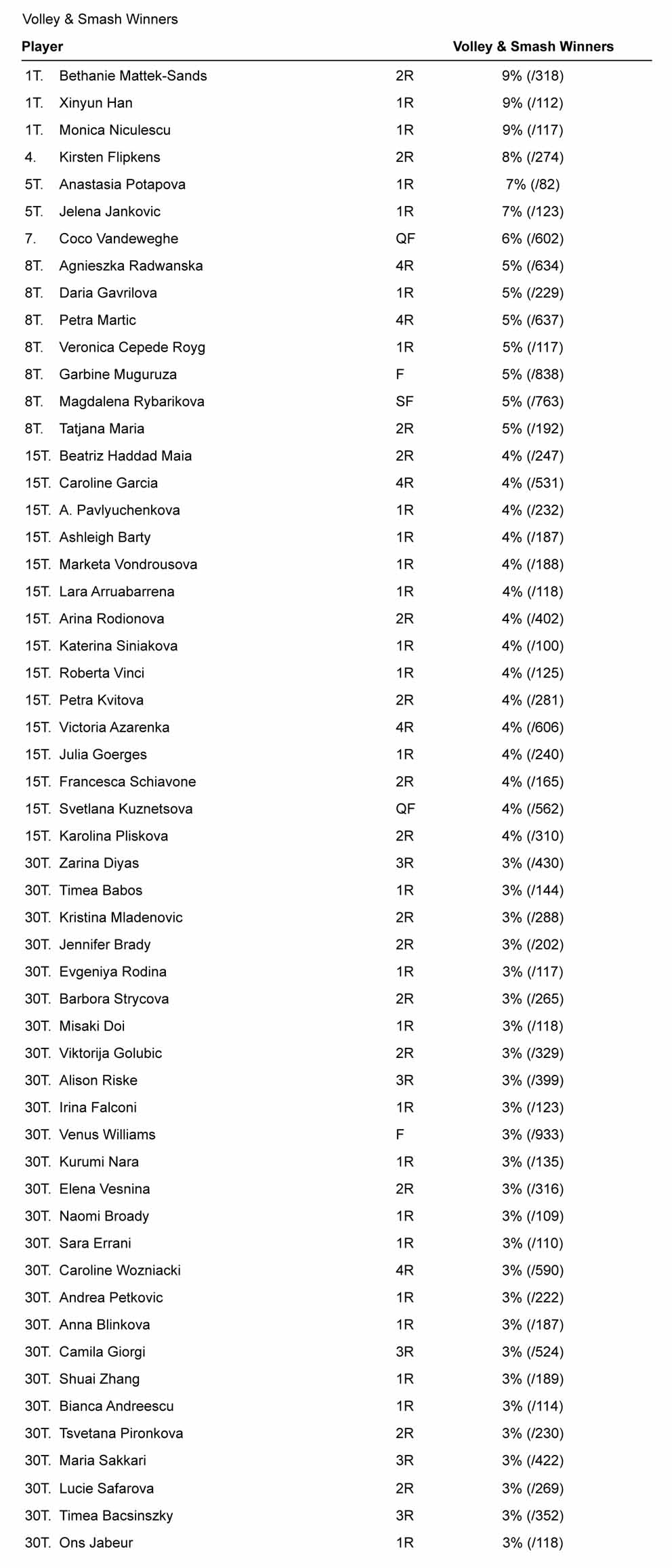 Chiude questa sezione la classifica dei vincenti di volo, che vede al primo posto la sfortunata Mattek-Sands, che ritroveremo più avanti nella classifica dei Serve&volley. In ogni caso numeri non molto alti, a conferma del fatto che nel gioco contemporaneo si scende a rete poco.