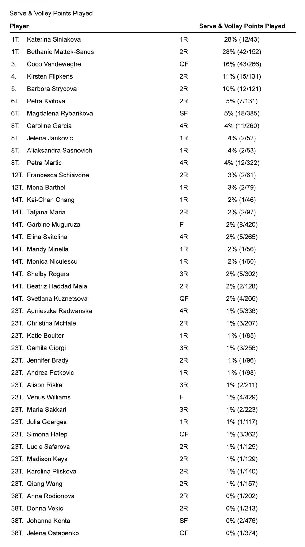 Nella sezione “Strategy” gli analisti di Wimbledon hanno inserito il serve&volley, una soluzione di gioco articolata e ormai molto rara. Sembra che abbiano provato a utilizzarlo con una certa frequenza Bethanie Mattek-Sands e Katerina Siniakova. Personalmente non mi sorprende la presenza di Mattek-Sands, mentre non mi aspettavo quella di Siniakova; ma purtroppo non ho visto il suo match (perso contro Maria Sakkari) e quindi non posso dire di più.