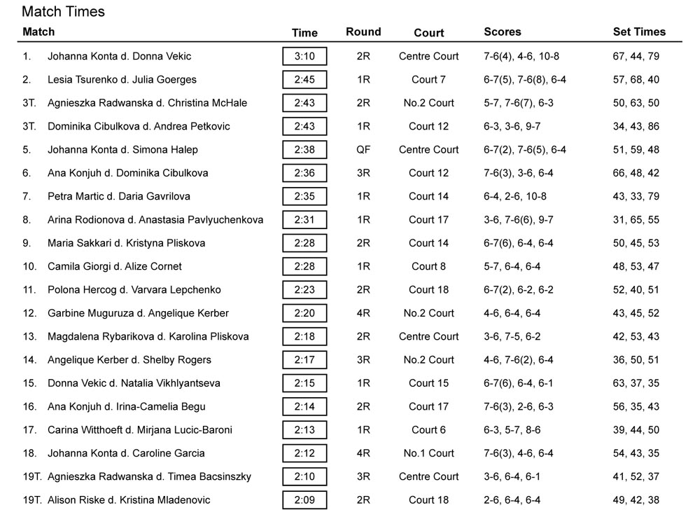 Una breve nota su quelle più corte. Delle 127 partite totali, nove sono durate meno di un’ora, e la più breve in assoluto si è svolta al secondo turno: Bacsinszky def Kucova 6-1, 6-0 in 48 minuti.