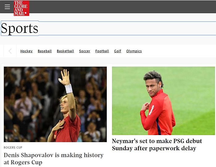 Il Globe and Mail di Toronto invece dedica una posizione importante, seppur nella sezione sport, alla vittoria di Shapovalov, prima del debutto di Neymar con la maglia del PSG.