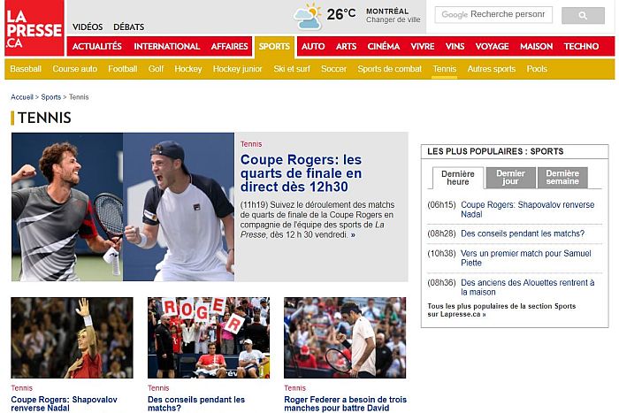 Diverso rilievo viene invece dato dai giornali francofoni: La Presse, prestigioso quotidiano ultracentenario di stampo politico, che da un paio d’anni ha deciso di rinunciare alla propria edizione cartacea per trasferirsi interamente online, richiama Shapovalov solamente nella sezione sport, e dopo il preview delle partite odierne.
