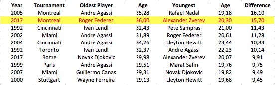 L’Open del Canada a Montreal ha messo di fronte ieri in finale i due giocatori con il secondo più ampio scarto di età nella storia dei Masters 1000 dalla loro creazione nel 1990. Roger Federer, 36 anni appena compiuti è stato sconfitto da Alexander Zverev, 20 anni compiuti ad aprile. Ma ciò che è ancora più sorpredente è che il record assoluto rimane quello della finale giocata il 14 agosto 2005, giocata sullo stesso campo. In quell’occasione il 35enne Andre Agassi sfida il nuovo campione del tennis, un giovanissimo Rafael Nadal, 19 anni.