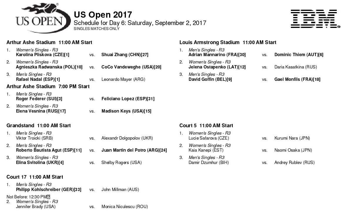 Nella sesta giornata degli US Open i due tabelloni di singolare si allineano agli ottavi di finale. I due numeri 1 del mondo, Karolina Pliskova e Rafael Nadal, apriranno e chiuderanno il programma della sessione diurna dell’Arthur Ashe. La ceca, dopo la prova negativa contro Gibbs, è chiamata ad un impegno non semplice contro la cinese Shuai Zhang, testa di serie numero 27; Nadal invece sarĂ opposto al lucky loser argentino Leonardo Mayer, contro il quale non ha mai perso un set. Il secondo match del centrale sarĂ tra la bombardiera CoCo Vandeweghe e la “maga” Agnieszka Radwanska; la statunitense è a caccia del primo ottavo di finale nello slam di casa.