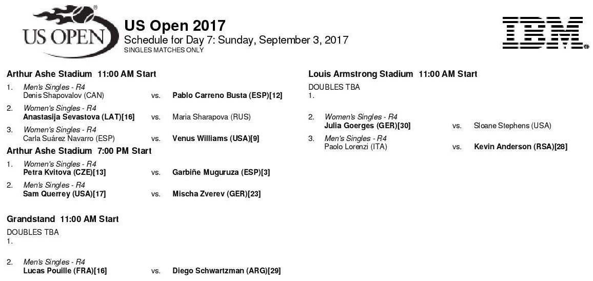 Settima giornata a Flushing Meadows dedicata agli ottavi di finale della parte bassa dei due tabelloni. Il match che ci interessa di più e ovviamente quello del nostro Paolo Lorenzi che sfida Kevin Anderson per uno storico traguardo. Si giocherà sul Louis Armstrong come terzo match dopo un match di doppio e la sfida tra Sloaene Stephens e Julia Goerges (inizio del programma sempre alle 17:00, ora italiana, su tutti i campi).