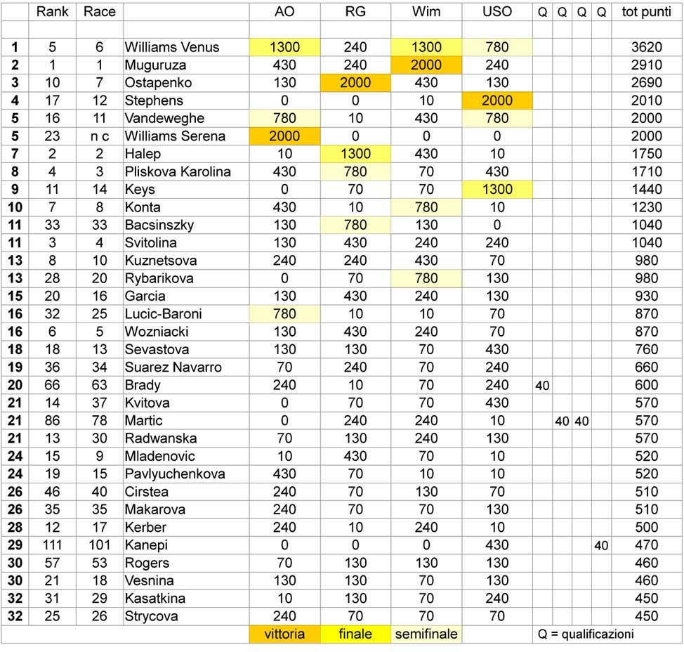 Per avere una risposta ho semplicemente sommato i punti ottenuti da ciascuna giocatrice nei quattro Slam secondo il criterio di calcolo ufficiale WTA, che prevede questa ripartizione: 2000 punti (vittoria), 1300 (finale), 780 (semifinale), 430 (quarti), 240 (ottavi), 130 (3°turno), 70 (2° turno), 10 (sconfitta al primo turno). In più, nel caso di giocatrici provenienti dalle qualificazioni ho indicato i punti ulteriori ottenuti nei tre turni preliminari di accesso (40 per chi vince i tre match ed entra nel main draw).