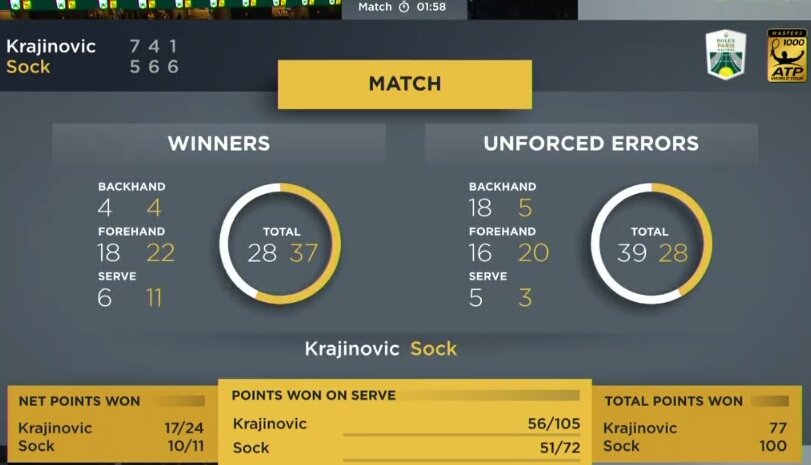 Gran torneo di Krajinovic, solo applausi per lui, tutto il merito tecnico e sportivo possibile per Sock, che si è guadagnato il trionfo finale con grinta, potenza, e soprattutto tanta simpatia. Era da Miami 2010 (Andy Roddick, anche lui del Nebraska, che razza di combinazione) che uno statunitense non vinceva un “1000”, erano 107 le vittorie consecutive di giocatori europei in tornei da questo livello in su (qundi anche Slam e Finals), per il tennis a stelle e strisce era decisamente ora di alzare un trofeo importante.