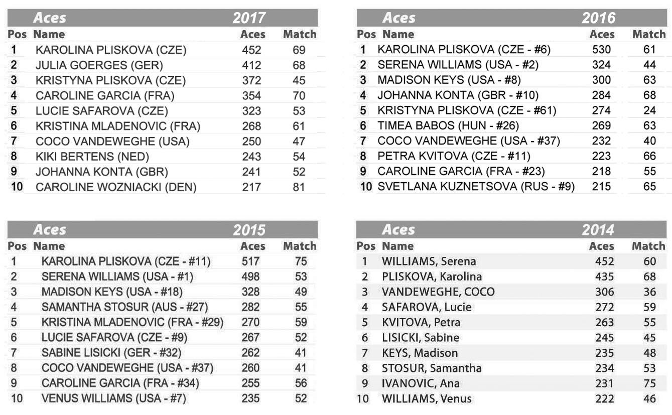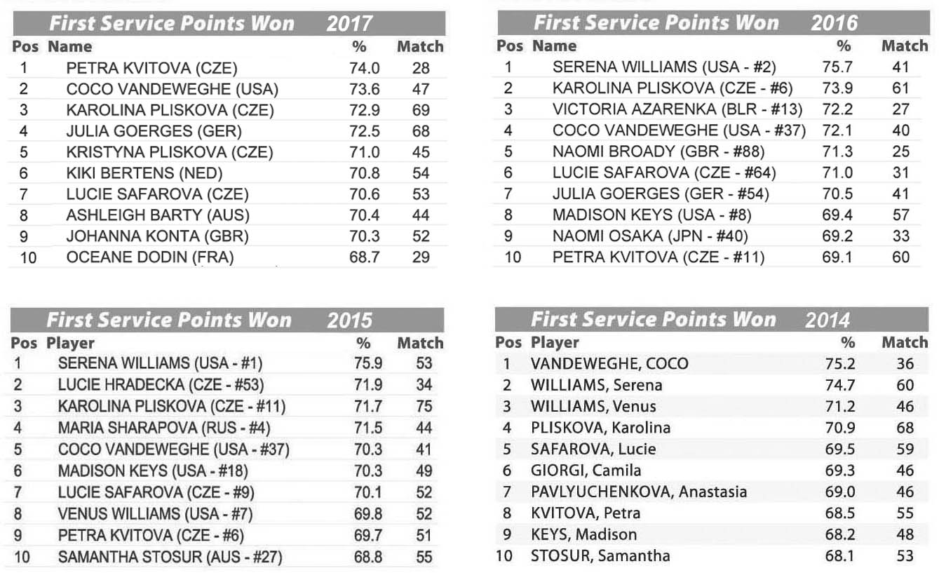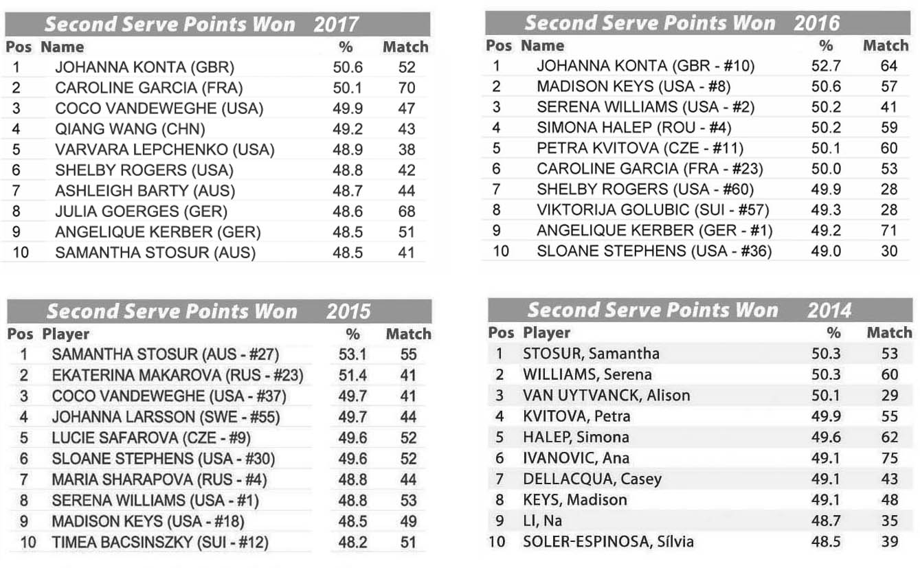 Qui Johanna Konta conferma la leadership già conquistata del 2016, rimanendo in cima a una delle statistiche cruciali nel tennis. Solidità alla battuta unita alla capacità di vincere anche palleggi prolungati, fanno di Johanna una tennista equilibrata e solida, anche quando non le entra la prima di servizio. Solo lei e Caroline Garcia nel 2017 sono riuscite a superare la soglia del 50% di punti vinti con la seconda, quota di assoluta eccellenza per gli standard femminili: