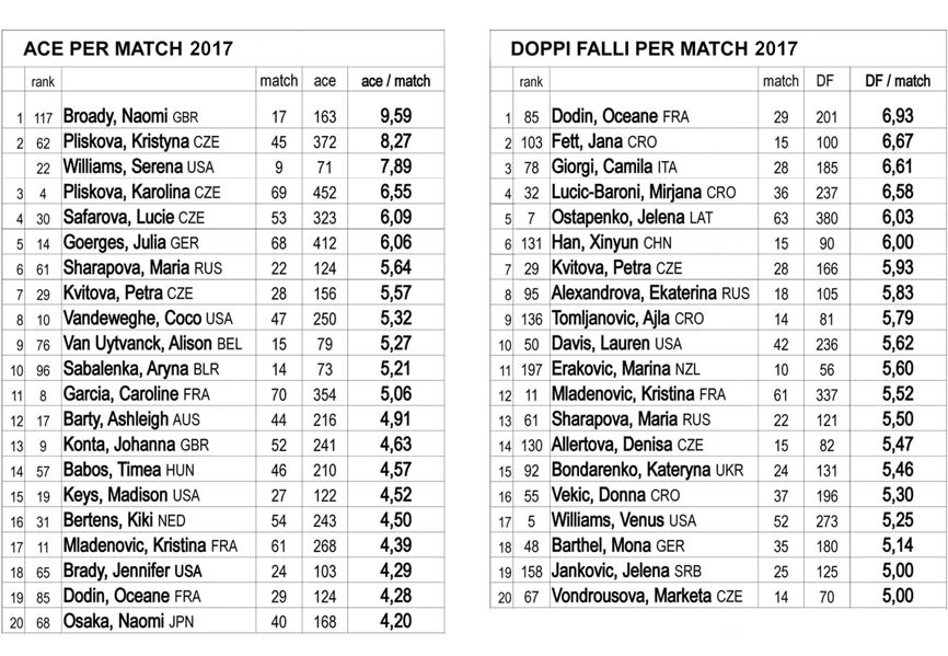 A destra la classifica calcolata allo stesso modo per i doppi falli (media dei doppi falli compiuti per match). Non è una novità la presenza ai piani alti di Dodin, Giorgi e Lucic-Baroni, ma forse il dato più significativo è il quinto posto di Ostapenko, a indicare un aspetto del suo tennis nel quale la campionessa del Roland Garros ha margini di miglioramento, visto che Jelena sulla seconda non prende gli stessi rischi delle prime giocatrici in graduatoria.
