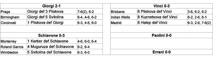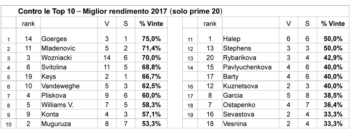 In generale si può dire che sono lontani i fasti del 2015: l’unica italiana in grado di battere Top 10 è stata Camila Giorgi. Se non altro questo può essere un dato incoraggiante per la sua carriera; in una annata di poche soddisfazioni è almeno riuscita a tornare a sconfiggere due volte le migliori. A Camila non accadeva da due anni; tanto è passato fra il successo di Katowice (aprile 2015) contro la numero 4 Radwanska e quello di Praga contro la numero 3 Pliskova (maggio 2017). Nel 2016 infatti Giorgi aveva ottenuto un pessimo score contro le Top 10 (zero vinte, cinque perse), score che ha “macchiato” uno dei suoi record migliori. In carriera infatti contro le prime dieci Giorgi vanta per il momento un record di 8 vinte e 12 perse, che senza il deficitario 2016 sarebbe addirittura in attivo.