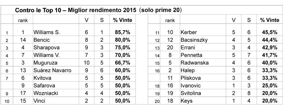 Nel 2015 Bencic terminò la stagione con l’ottimo record di 8 vinte e 2 perse contro le Top 10. Ecco la tabella relativa alle prime 20: