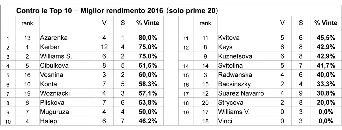E, per completare la sequenza, la stessa tabella relativa al 2016. Azarenka comandava davanti alle leader stagionali Kerber e Serena Williams. Segnalo il deficitario rendimento di Venus Williams, con zero vittorie, che sono però diventate sette quest’anno: