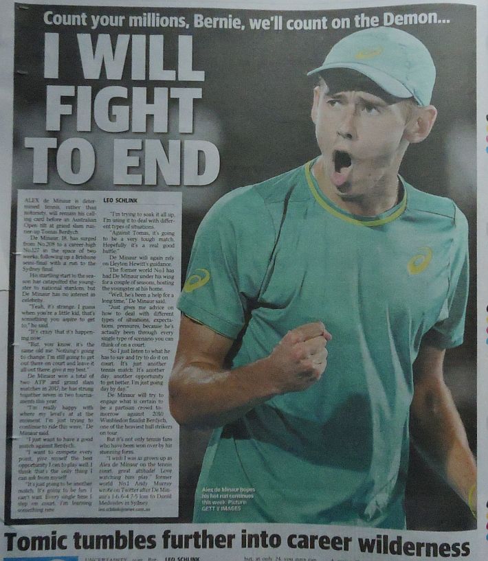Herald Sun, in modo forse condivisibile, dopo l’ennesima dimostrazione di maleducazione nei confronti della stampa e dello stesso sport del tennis da parte di Bernard Tomic (alla fine del match perso con il nostro Lorenzo Sonego), opta per la linea editoriale del “non diamogli attenzione, non la merita“, il che è abbastanza inaspettato e significativo per una testata anglosassone, di solito su queste cose in Australia ci sguazzano quasi peggio dei tabloid inglesi. Un trafiletto a fondopagina (pagina in cui viene incoraggiato con affetto il giovane Alex De Minaur), e ciao ciao Bernie.