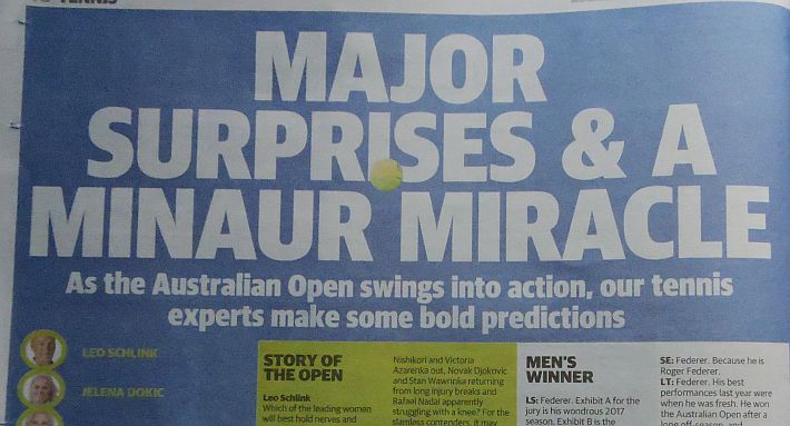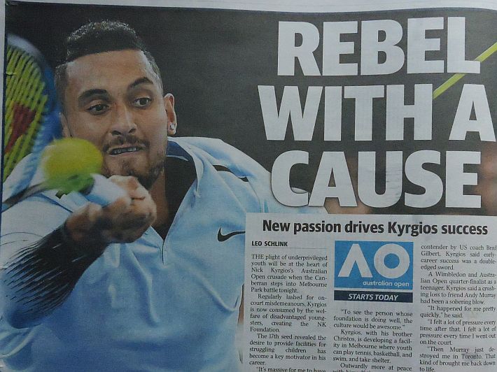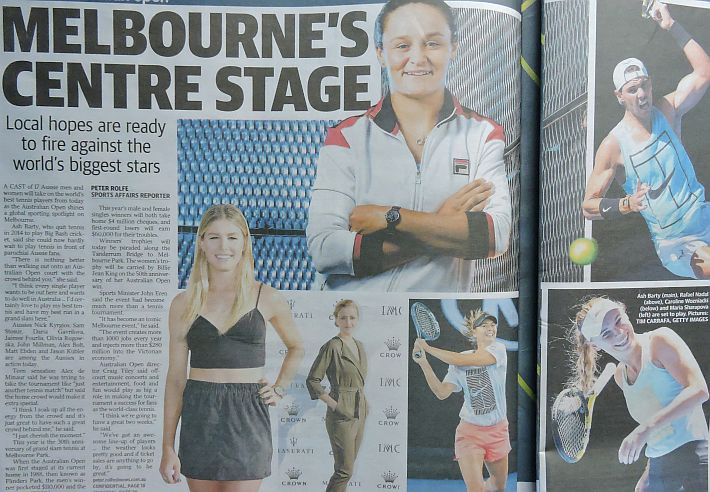 MELBOURNE - Il quotidiano cittadino Herald Sun sceglie di relegare le follie di Bernard Tomic a un trafiletto. Federer favorito degli esperti. Incoraggiamenti per i giocatori di casa, con la coppia De Minaur e Gavrilova in prima pagina. Fiducia e un rinnovato affetto per Nick Kyrgios