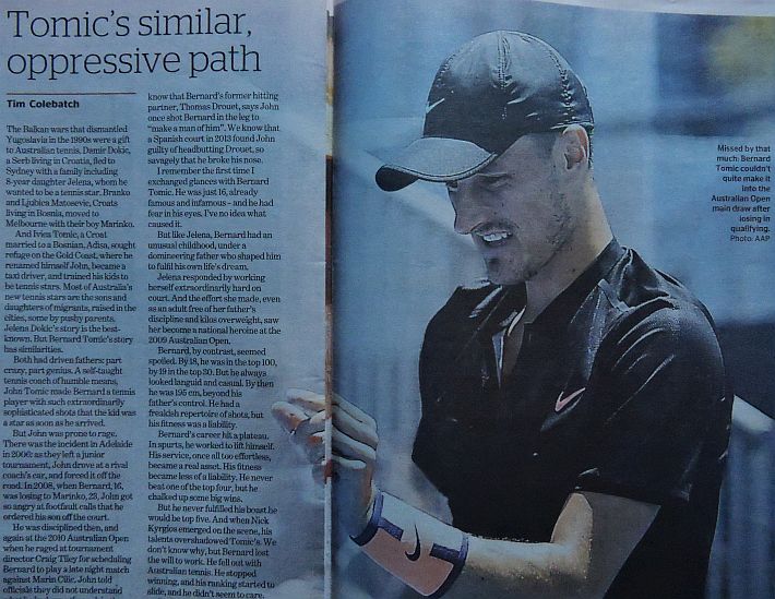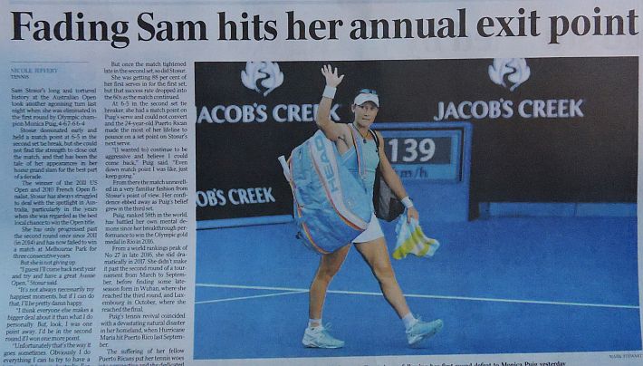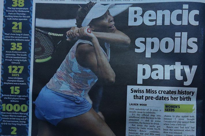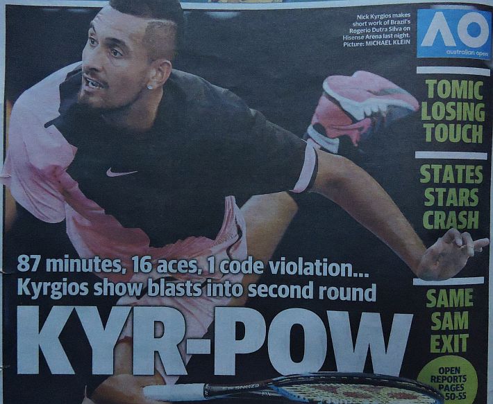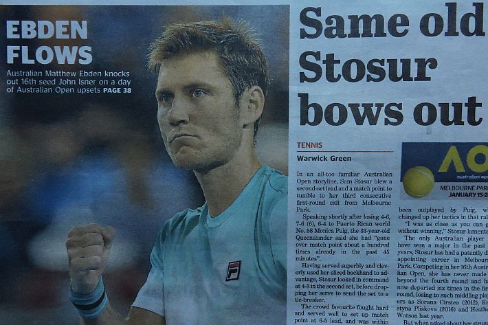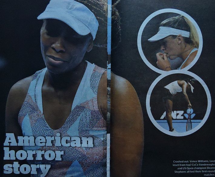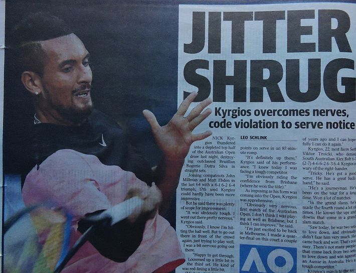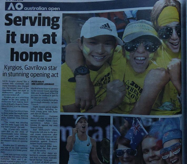 Dopo il Day 1 dell’Australian Open, Herald Sun, The Age e Australian si focalizzano, comprensibilmente, sui tennisti locali. Tutti felici per Nick Kyrgios, ed è un bel cambio di atteggiamento rispetto alle critiche feroci dei tempi passati, viene esaltata anche la prestazione di Daria Gavrilova, e soprattutto quella di Matthew Ebden con la sua bella vittoria su John Isner. Dispiace per Sam Stosur, la cui striscia negativa nello Slam di casa assume i contorni della maledizione, e si dà un certo risalto anche all’eliminazione di Venus Williams a opera di Belinda Bencic. Solo su Herald Sun, il giornale di Melbourne, si racconta della riunione dei giocatori capitanata da Djokovic e probabilmente volta all’ottanimento di maggiori benefici economici per i tennisti di seconda fascia. Un pezzo viene dedicato alla parabola discendente di Bernard Tomic, in un altro il momentaccio del tennis statunitense si merita il titolo più scontato ma efficace di tutti: “American Horror Story”, in riferimento alla serie televisiva di gran successo che anche da queste parti piace molto.