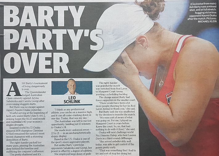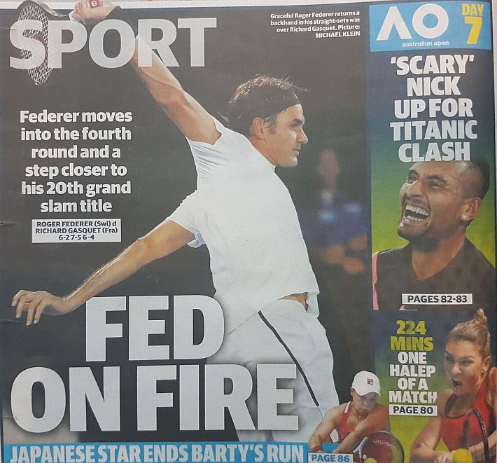 Naomi Osaka, eliminando Asleigh Barty, ha dato un grosso dispiacere a una nazione intera. Nick Kyrgios, ormai, viene trattato come potenziale salvatore della Patria. Ammirazione per Hyeong Chung, stupore per il modo autoritario con cui Angelique Kerber ha fatto fuori Maria Sharapova. Attenzione a Novak Djokovic, e spazio alla partita epica vinta da Simona Halep su Lauren Davis. E naturalmente, una bella pagina dedicata a Roger Federer.