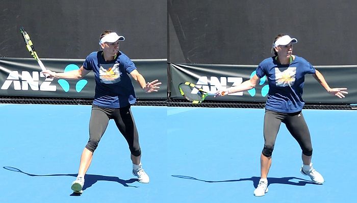 Il prerequisito più importante di un efficace “footwork”, nel tennis (e non solo) è il primo passo, quello di partenza. Da lì si possono limare preziose frazioni di secondo, arrivando allo scatto di corsa e all’allungo con quel minimo di rapidità in più che fa la differenza, per esempio, tra un recupero disperato e difensivo e un passante ben riuscito. Si inizia con un tipo particolare di split-step, detto (almeno dai tecnici americani) “gravity step”, semplicemente, dal saltello a piedi pari coordinato con l’impatto del colpo avversario che si effettua sempre e comunque per portarsi in posizione dinamica di partenza, si ricade mettendo a contatto con il terreno per primo il piede esterno, opposto alla direzione che si desidera prendere. In qusto modo, ci si sbilancia volutamente dal lato (o anche l’avanti) verso cui si deve scattare. Più facile da fare che da raccontare, niente paura. Da qui, partirà lo spostamento, che andiamo a vedere in compagnia delle nostre Maestre di footwork. Campi 17 e 18 di Melbourne Park, dieci di mattina, caldo ma non troppo, due belve da tennis in piena azione: cosa chiedere di più?