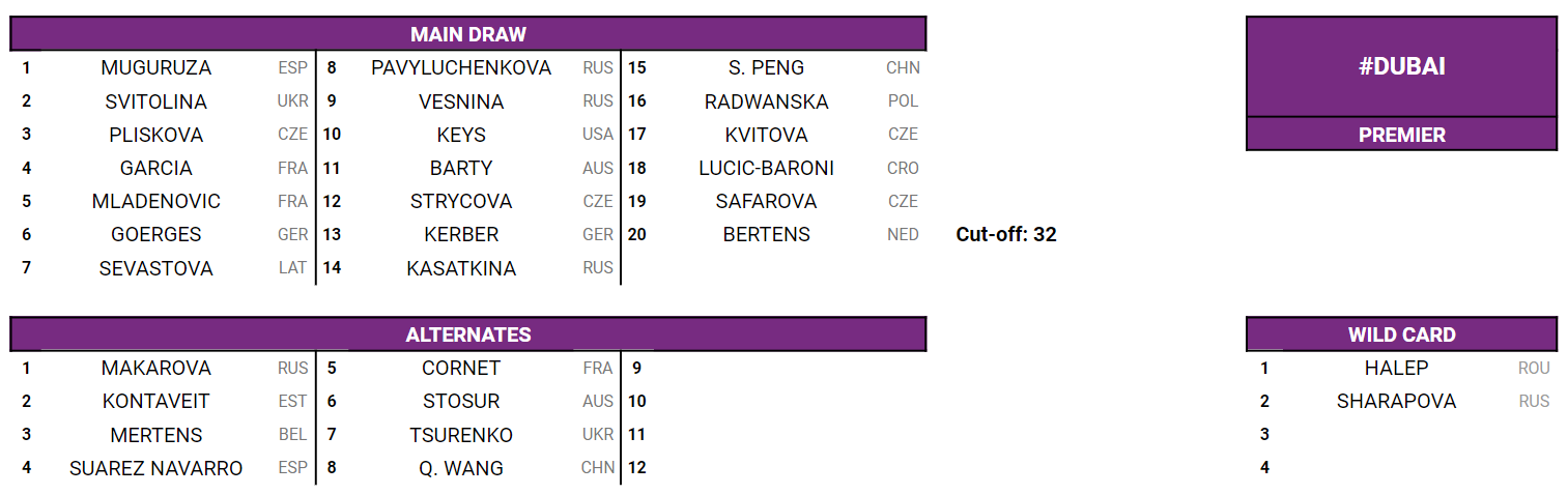Oltre alla tennista rumena ai nastri di partenza ci sarà anche Maria Sharapova. La tennista siberiana usufruirà anche lei di una WC, accedendo così al tabellone principale del torneo dal quale manca ormai da 12 anni, da quando nel 2006 venne sconfitta in finale da Justine Henin. “Maria Sharapova ha avuto molti successi e vinto molti titoli, ma qui affronterà avversarie molto forti che vorranno ugualmente rivendicare per sé il titolo di Dubai. Sarà interessante vedere se riuscirà a sconfiggere le sfidanti, che saranno probabilmente ancor più determinate nel volerla sconfiggere”, ha dichiarato ancora Colm McLoughlin.