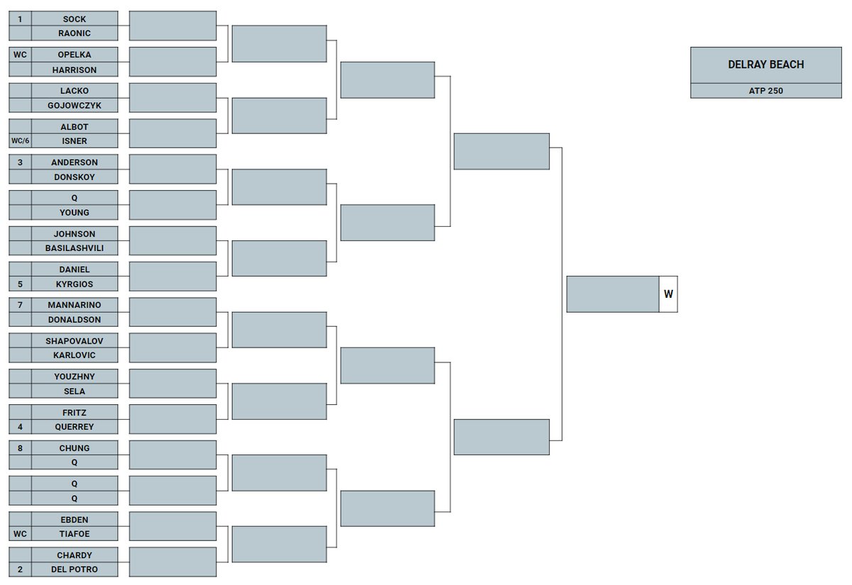 Tabellone inusuale per un ATP 250 a Delray Beach – non ci sono bye, trentadue giocatori al via – ma di ottimo livello. Hanno scelto il cemento della Florida per riprendere l’attività agonistica Juan Martin del Potro e Denis Shapovalov, due giocatori che ci si attende tra i protagonisti dei primi due Masters 1000 stagionali. Shapovalov dovrà domare Karlovic al primo turno, l’urna avrebbe potuto essere più gentile. Nick Kyrgios era in tabellone ma si è ritirato per problemi al gomito: la defezione dell’australiano ‘scongiura’ anche il primo turno di fuoco per il primo favorito de seeding Jack Sock che avrebbe dovuto affrontare Milos Raonic, e invece esordirà contro John-Patrick Smith. Si rivedrà anche Hyeon Chung dopo il periodo di ‘ricostituzione’ post-Australian Open, mentre alla già folta rappresentanza di giocatori di casa si sono aggiunte le tre wild card Isner, Tiafoe e Opelka.