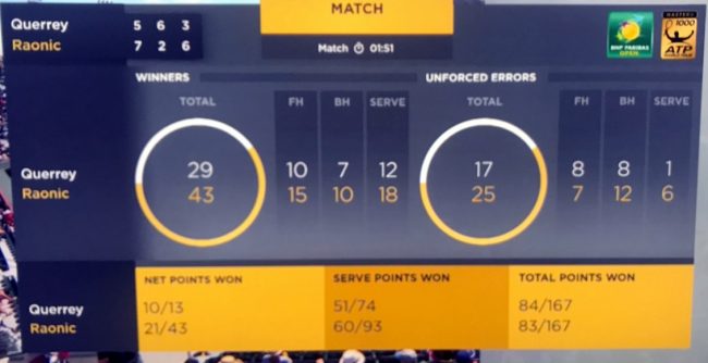 Il pugno in faccia sveglia Querrey, che nel secondo set è bravo a ritrovare il filo smarrito nei giochi decisivi del primo. In realtà non fa molto più che portare avanti i suoi schemi senza fretta e patemi, il resto lo fa un Raonic in debito d’ossigeno che fatica a raggiungere la posizione ottimale per la volée e molla visibilmente. Due break sanciscono il 6-2 che lascia l’ultima parola al decider. Milos ha il piccolo vantaggio di servire per primo e lo conserva bene ma sono entrambi ad essere ingiocabili alla battuta nei primi giochi del terzo. Semplicemente non si scambia. Raonic raggiunge i quindici ace, Querrey ne fa meno ma piazza tanti vincenti con la prima. Si gioca su un filo e Milos è il primo a rischiare di cadere, nel settimo gioco lo salva il coraggio con cui gioca a tutta uno smash fuori equilibrio da fondocampo. La palla prende mezza riga. Quello stesso coraggio che difetta a Querrey, che subito dopo in una situazione identica precipita affondando in rete un dritto da metà campo solo da chiudere. Raonic azzanna il momento, si prende il break e lo difende con le unghie piazzando due aces su altrettanti vantaggi esterni nell’atto finale. Vittoria significativa e complimenti anche a Ivanisevic, specialista nel rimotivare campioni. Se vincerà del Potro prepariamoci ad un’altra giornata calda…
