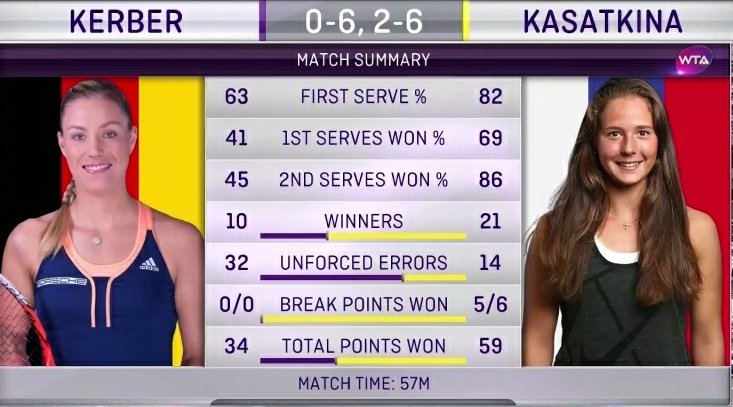 Di fronte a una tennista come Kasatkina, che ha nella difesa e nel dritto due punti molto forti, certe scelte di gioco mi sono sembrate degli autogol. Ecco il tabellino del match: