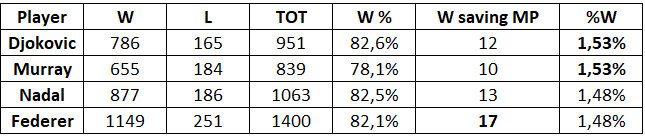 In queste due tabelle riepilogative evidenziamo quanto, in percentuale, impattano sul numero di vittorie complessive le vittorie ottenute salvando match point…