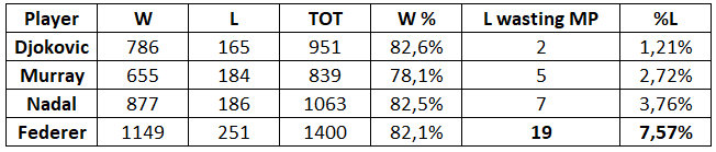 e quanto impattano sul numero di sconfitte complessive quelle subite dopo aver fallito match point
