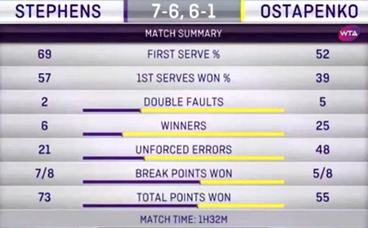 D’altra parte non sono nemmeno convinto del modo con cui Stephens ha vinto il match. La sensazione è che sia scesa in campo particolarmente nervosa, così nervosa da assumere un atteggiamento molto prudente, per non dire passivo. Però, malgrado non stesse brillando per intraprendenza, nel primo set ha quasi sempre condotto nel punteggio grazie alle mancanze dell’avversaria. E siccome Ostapenko con i suoi errori non le ha dato motivo per cambiare tattica anche nel secondo set, Stephens ha finito per portare a casa un match in cui non ha espresso tutte le sue potenzialità. Solo negli ultimissimi game ha provato qualche colpo più spinto, ma quando ormai la partita era segnata.