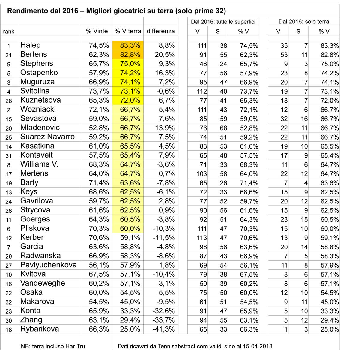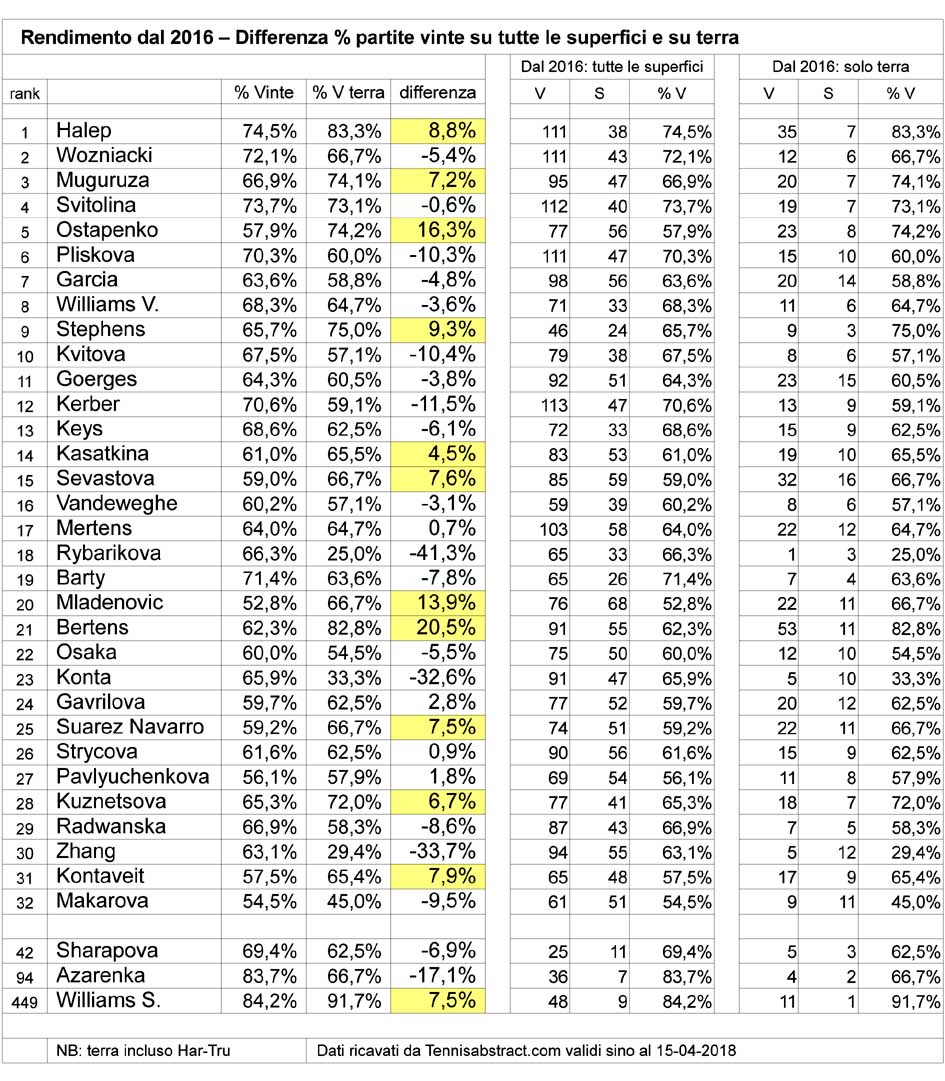 Nelle tabelle di questa pagina il criterio rimane lo stesso, ma i dati sono riferiti non più a tutta la carriera delle giocatrici ma soltanto alle ultime stagioni, da quella 2016 (inclusa) in poi. Ancora più marcato il progresso su terra di Ostapenko, ma emerge anche quello di Muguruza (ricordo che Jelena e Garbiñe sono le ultime due campionesse del Roland Garros), e di un’altra campionessa Slam (anche se sul cemento) come Stephens, in parte determinata però dalla presenza nel calcolo dell’Har-Tru di Charleston, dove Sloane vinse nel 2016.
