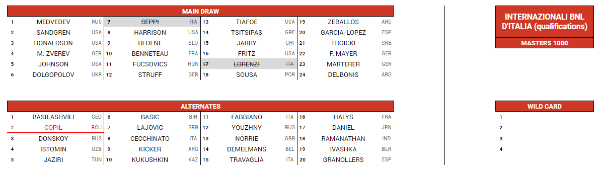In lista compaiono anche Andreas Seppi e Paolo Lorenzi, ai quali però è stata già garantita wild card per il tabellone principale insieme a Matteo Berrettini e al vincitore delle pre-qualificazioni, giunte ormai a ridosso della loro fase più calda. Proprio la lotteria delle pre-qualificazioni però, come già accaduto lo scorso anno, rischia purtroppo di penalizzare più di un azzurro: se il nostro paese è a corto di top 100, nella cinquantina di posizioni che segue c’è più di qualcuno che ha dimostrato un livello “da Foro”.